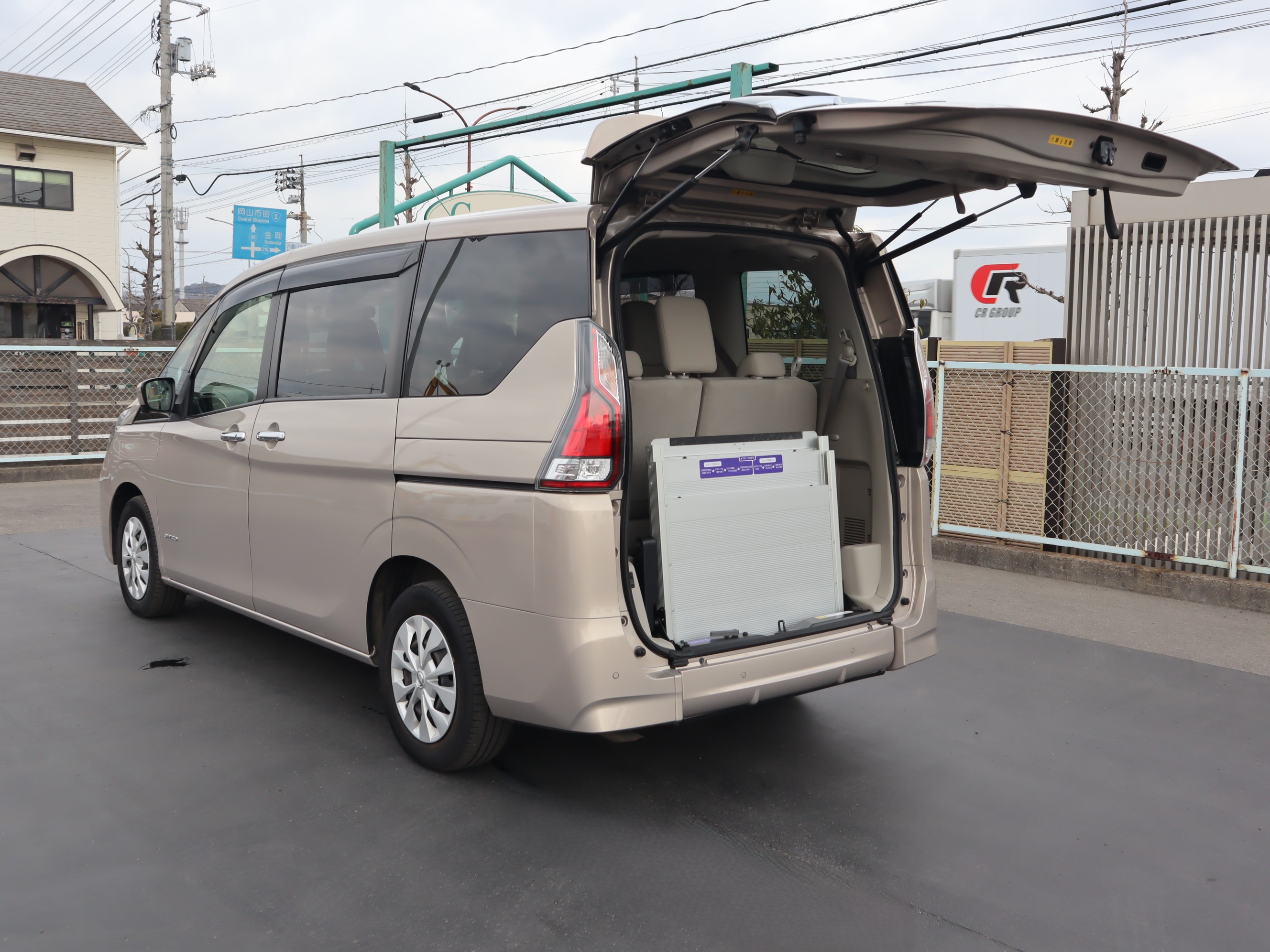 3列目シートを左右に跳ね上げて車いすの方が入ります。車いすの方1名と他に3名の4人乗りの状態です。