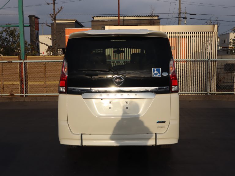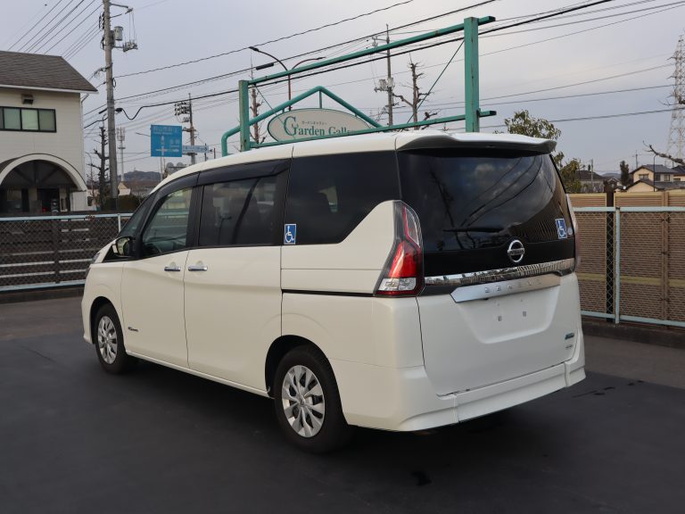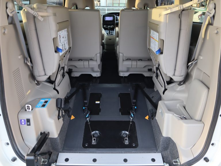 3列目シートを左右に跳ね上げて車いすの方が入ります。車いすの方1名と他に4名の5人乗りになります。