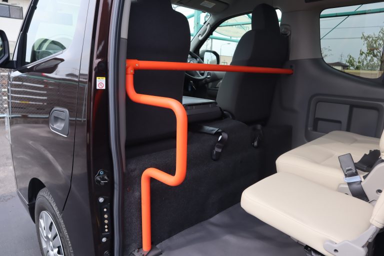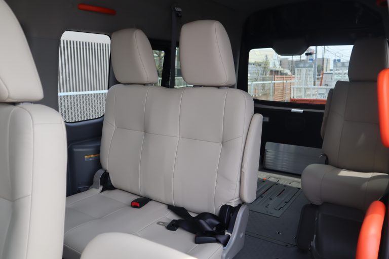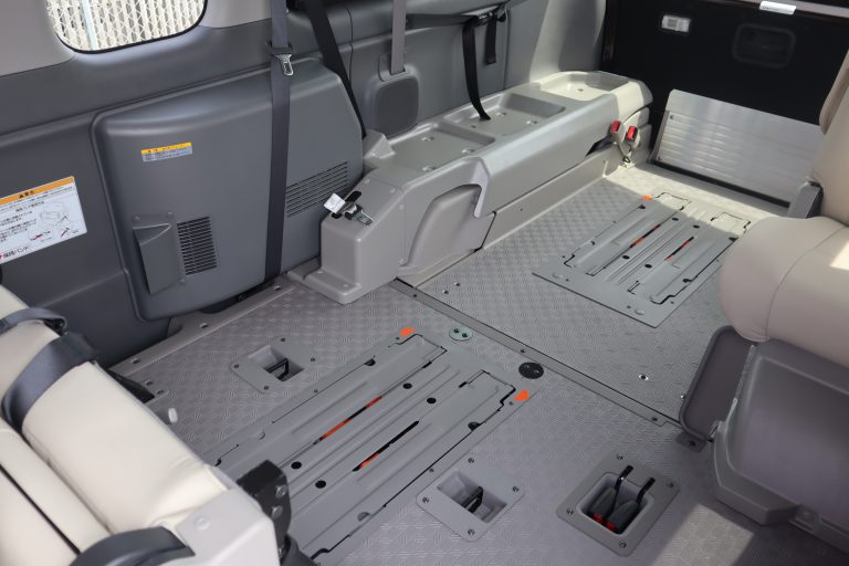 3列目シートを跳ね上げると車いすの固定装置が現れます。車いす2台仕様になります。 車いすの方2名と他に7名の9人乗りになります。