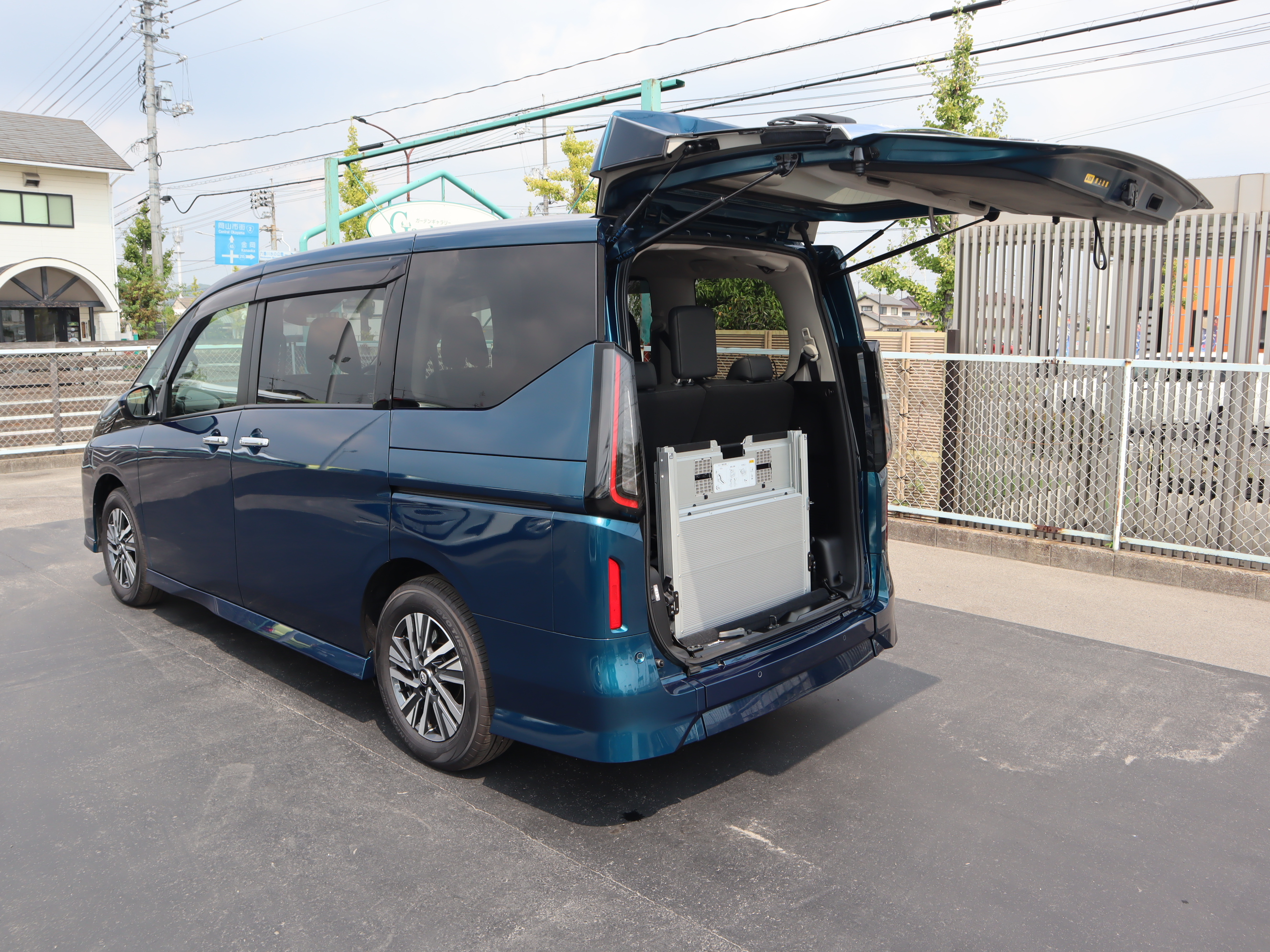 3列目シートを左右に跳ね上げて車いすの方が入ります。車いすの方1名と他に3名の4人乗りの状態です。