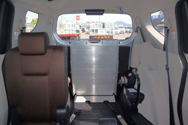 リヤシートの片側を跳ね上げて車いすの方が入ります。車いすの方1名と他に3名の4人乗りになります。