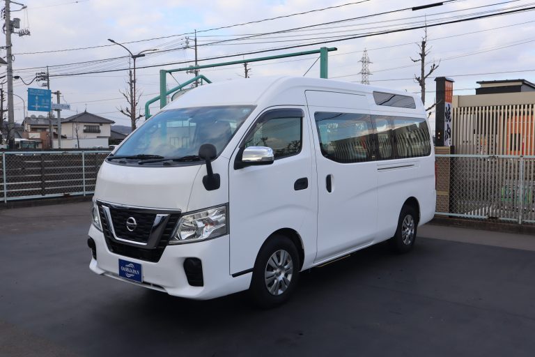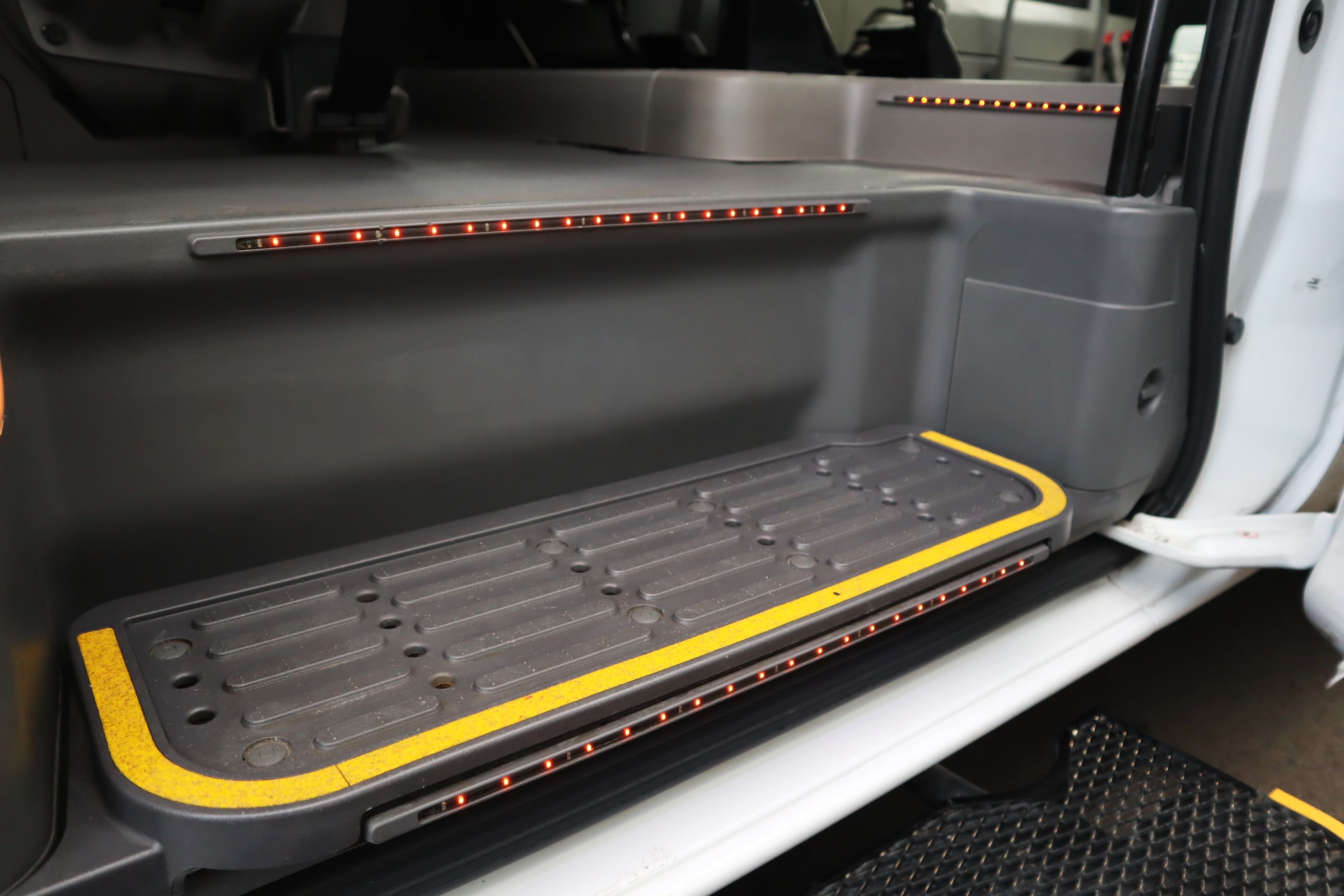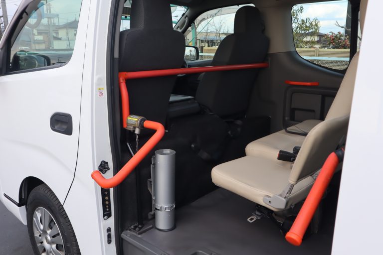 3列目シートを跳ね上げると車いすの固定装置が現れます。車いす2台仕様になります。 車いすの方2名と他に7名の9人乗りになります。