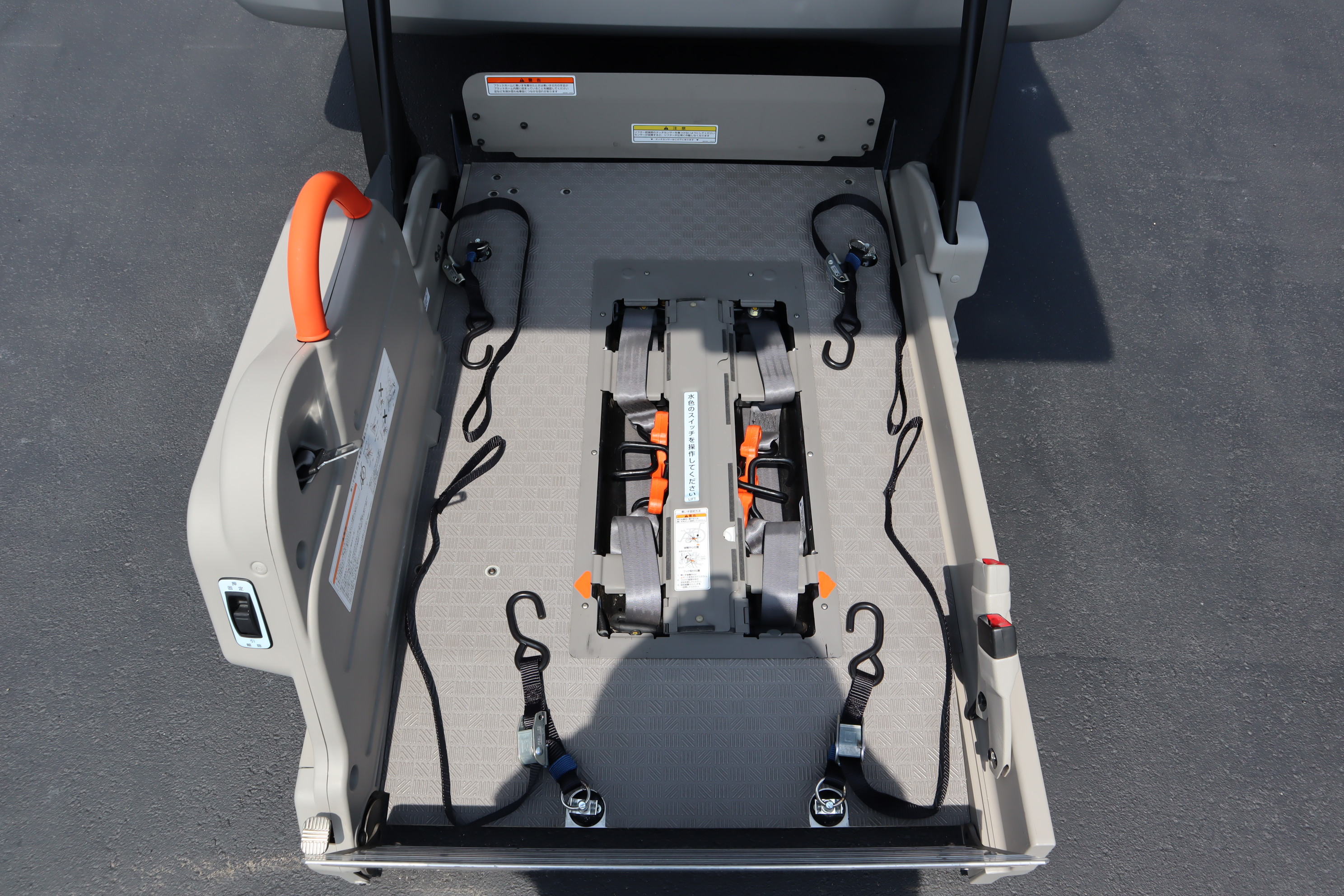車いすの固定は簡単電動式です。特殊車いす固定ベルト付きです。