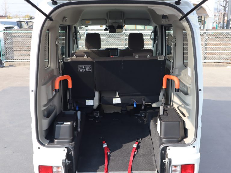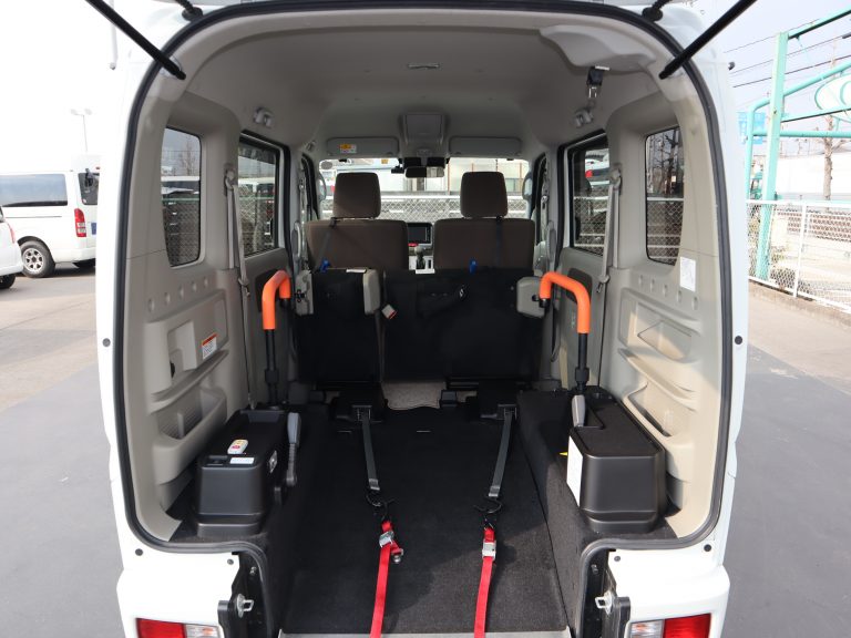 リヤシートをどちらも跳ね上げた状態です。車いすの方1名と他に2名の3人乗りになります。