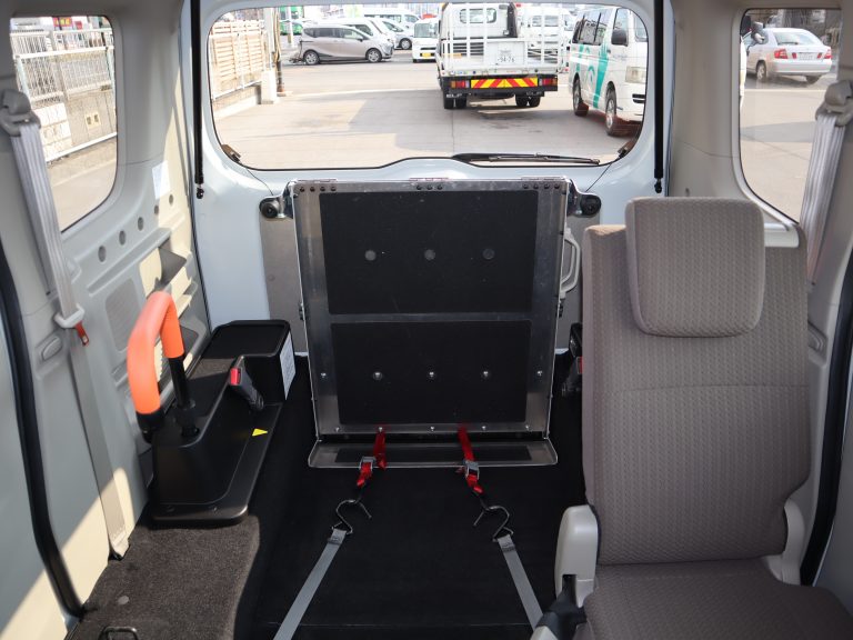 リヤシートの片側を跳ね上げて車いすの方が入ります。車いすの方1名と他に3名の4人乗りです。