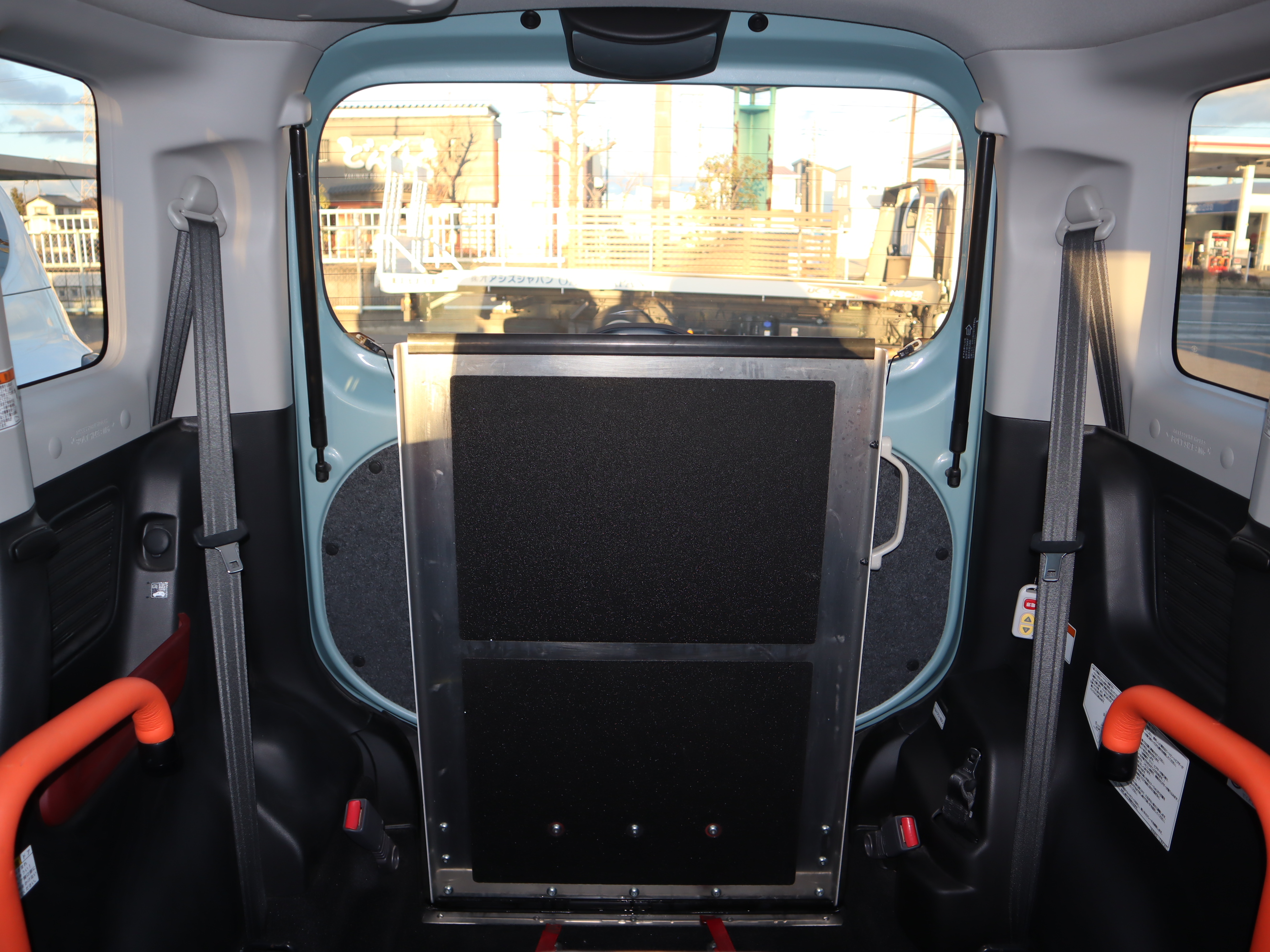 リヤシートを前方に跳ね上げて車いすの方が入ります。 車いすの方1名と他に2名の3人乗りです。