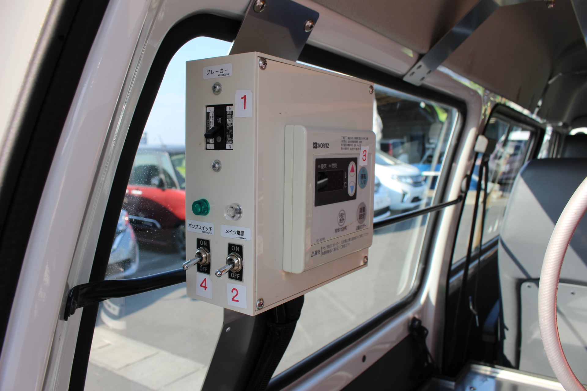 ABS、運転席・助手席エアバッグ、パワーウィンドー(前席)、集中ドアロック、スタッドレスタイヤ、浴槽、シャワーヘッド、タンカー、タンカーネット、送水ポンプ、ホース数種類、コードリール、テラル製ポンプ、ノーリツ製ボイラー | ||