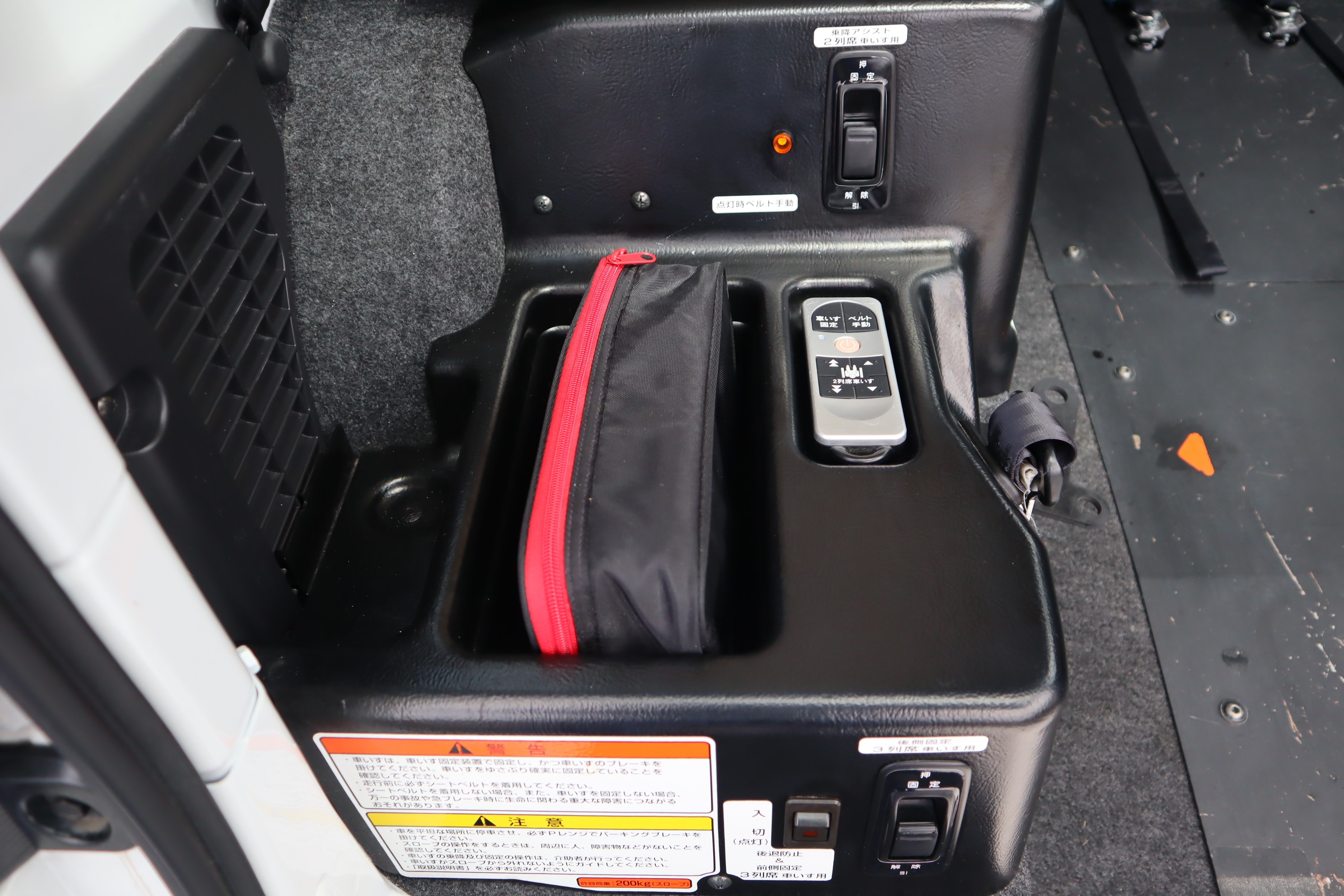 車いす固定のスイッチです。ウィンチの操作はリモコンで行います。